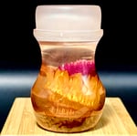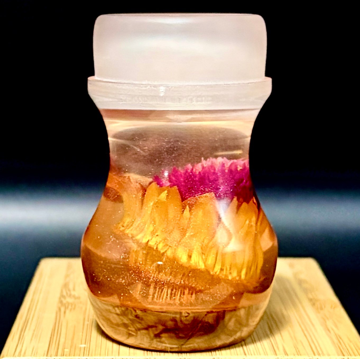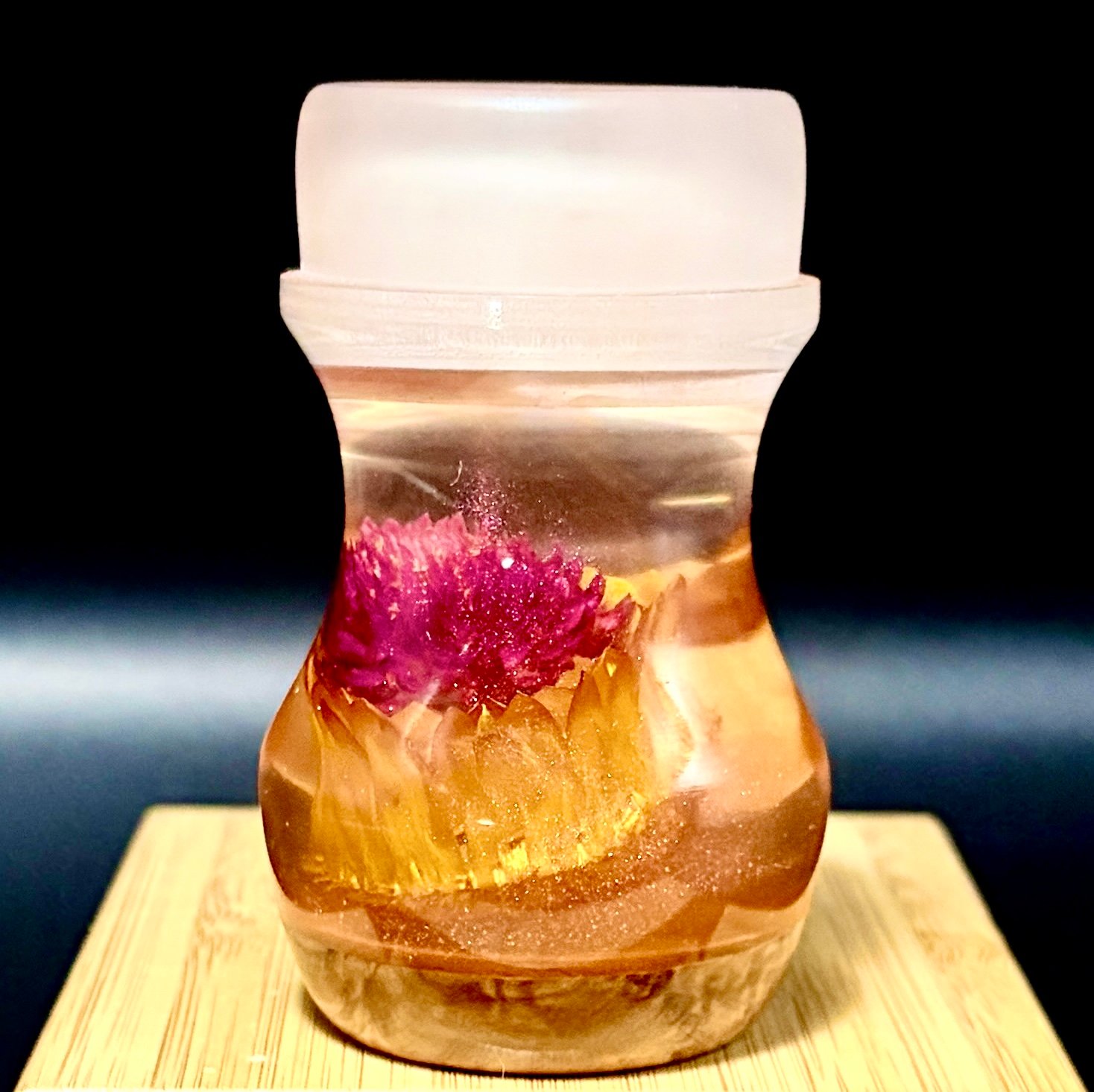 Handcrafted from brown mallee burl, the base anchors the piece in the earth — solid, grounded. Rising from it, a yellow paper daisy leans off balance, caught in the invisible force of a storm. At its centre, a vivid purple globe amaranth holds on, delicate yet defiant. The entire scene is suspended in clear resin with a warm golden tint, like light breaking through chaos.