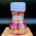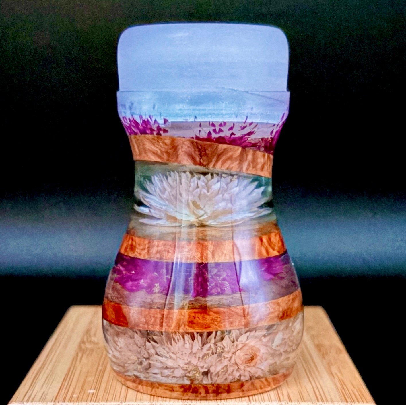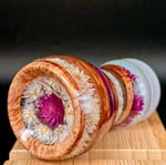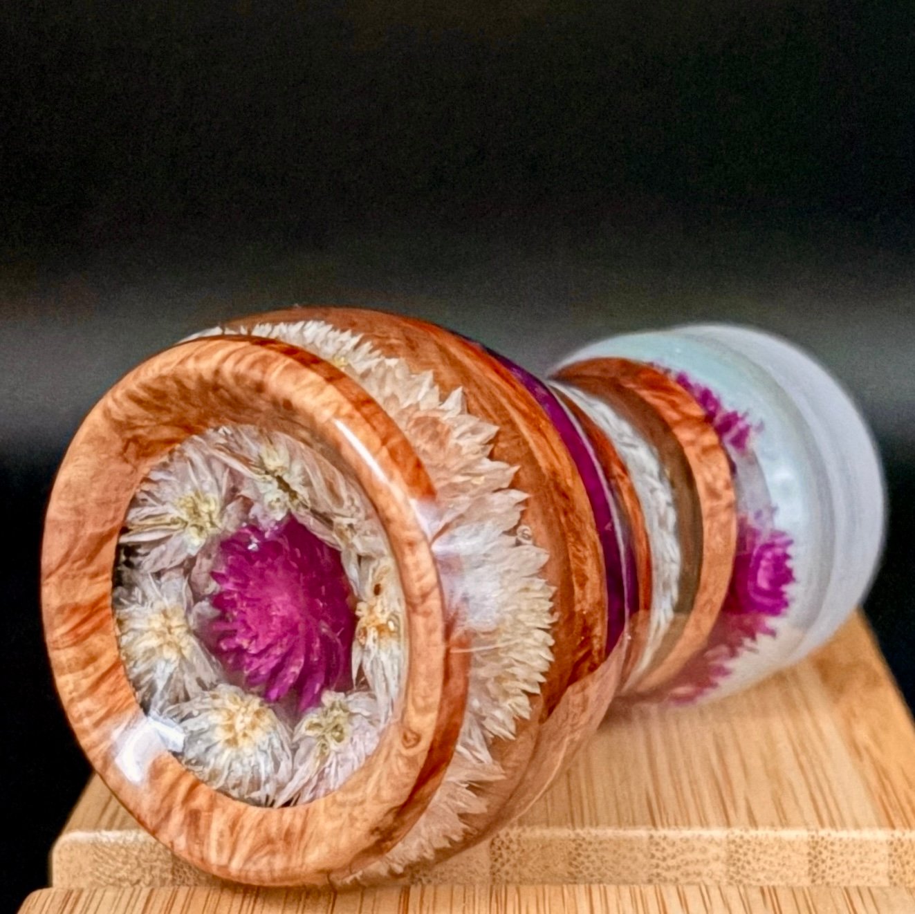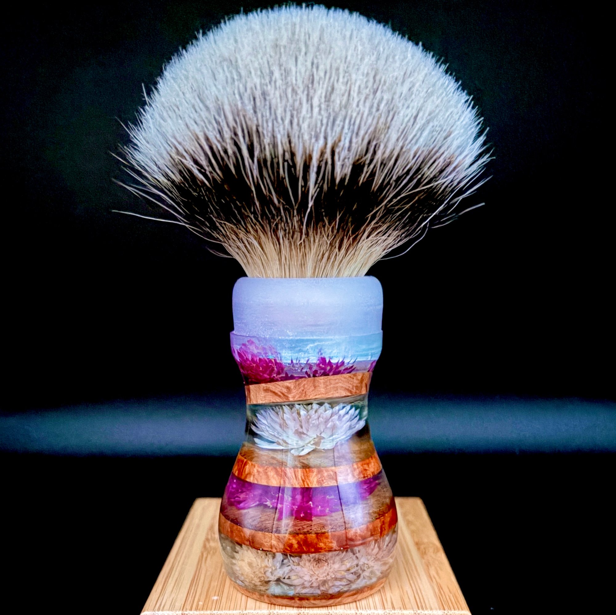 Now crank it up—the brush itself is a little rock show in your hand. The handle is built from brown mallee burl, stacked with thin wooden discs like layers of vinyl pressed into something timeless. On the base: a circle of pink globe amaranth flowers, each one facing outward like fans with their hands in the air. Flip it over and you’ll find the hidden track—a single purple globe amaranth at the centre, staring right back at you. It’s the soul of the piece, humming like feedback after the last chord.