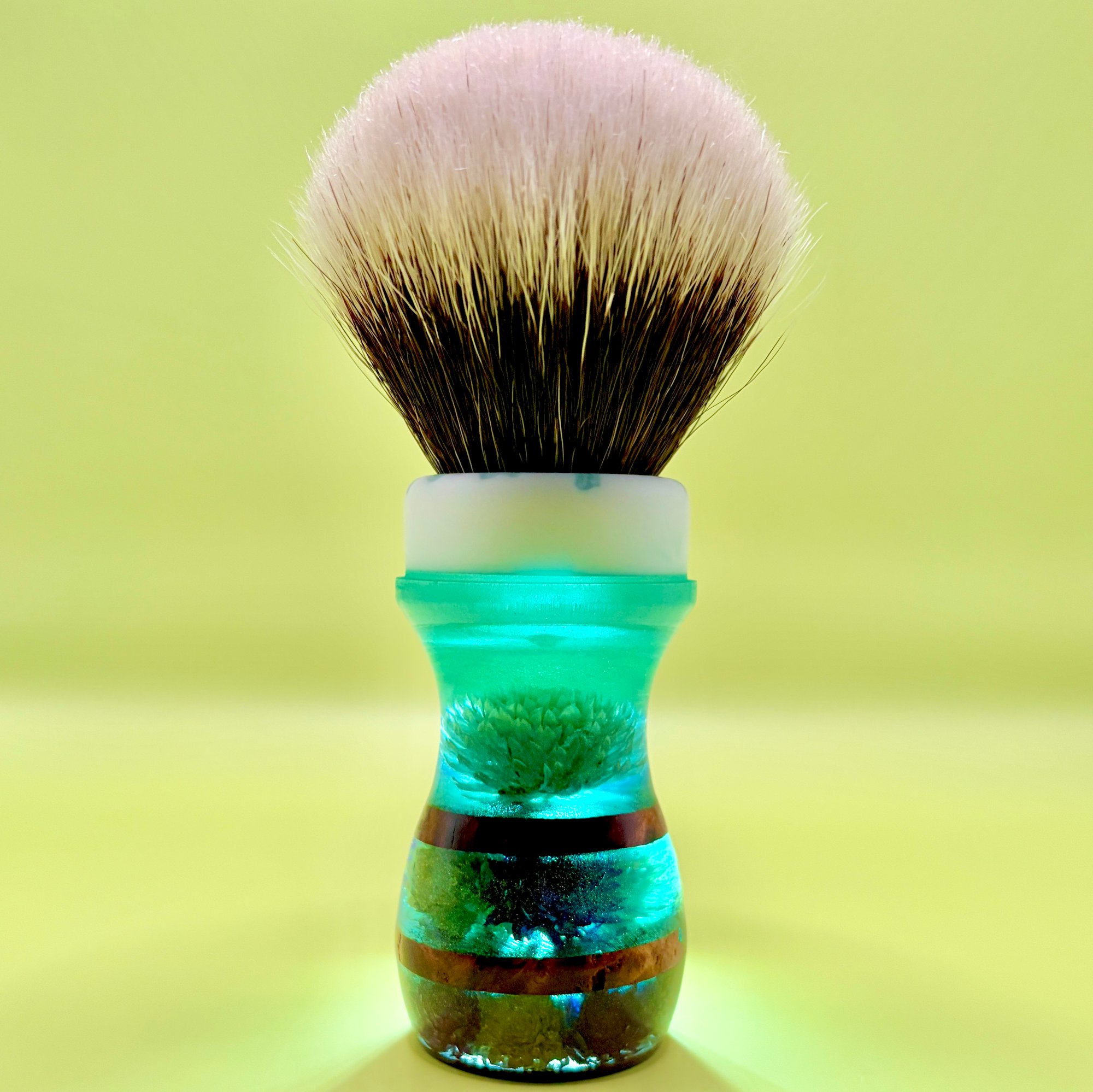 Threaded through it all are sparks of emerald and flashes of gold, shimmering in the epoxy like spotlights cutting through the smoke. The knot sits in a white crown, capped with a translucent turquoise drip that slides down like hot wax from a candle on a backstage amp—proof that even your morning shave can feel like a ritual with an encore.