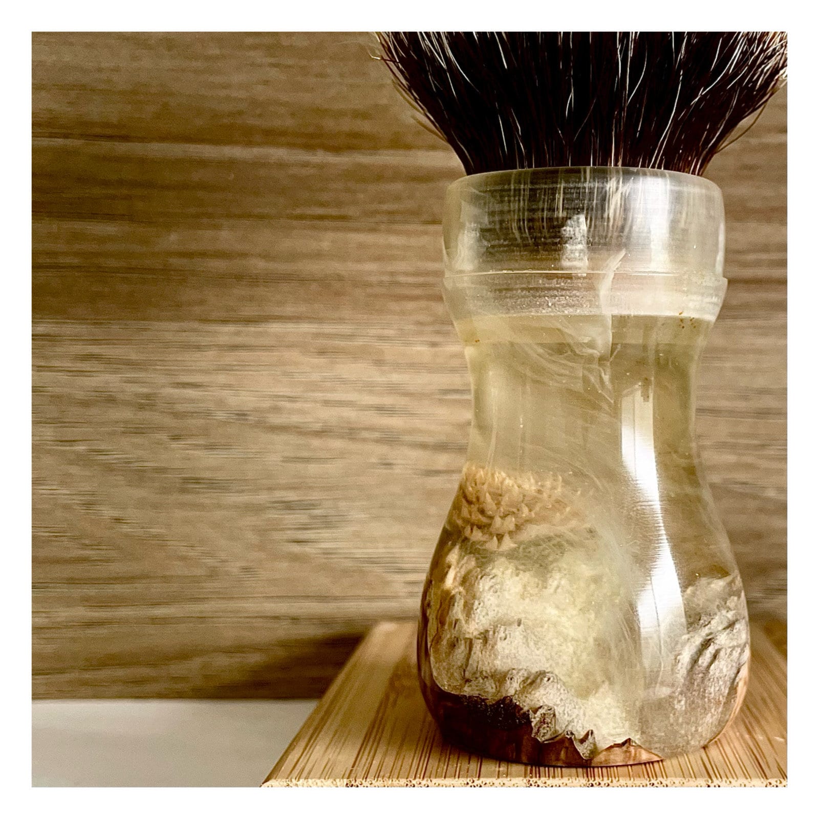 Handcrafted with passion (and a pinch of seaside inspiration) in Emerald Beach, Australia, this shaving brush is more than just a grooming tool—it’s a showpiece! Suspended in clear epoxy resin with dreamy white swirls that dance like smoke is a delicate white flower, frozen in time just for you. Below it rests a striking base of Australian native brown mallee burl from New South Wales, its wave pattern rippling like golden sands in the sun.