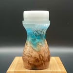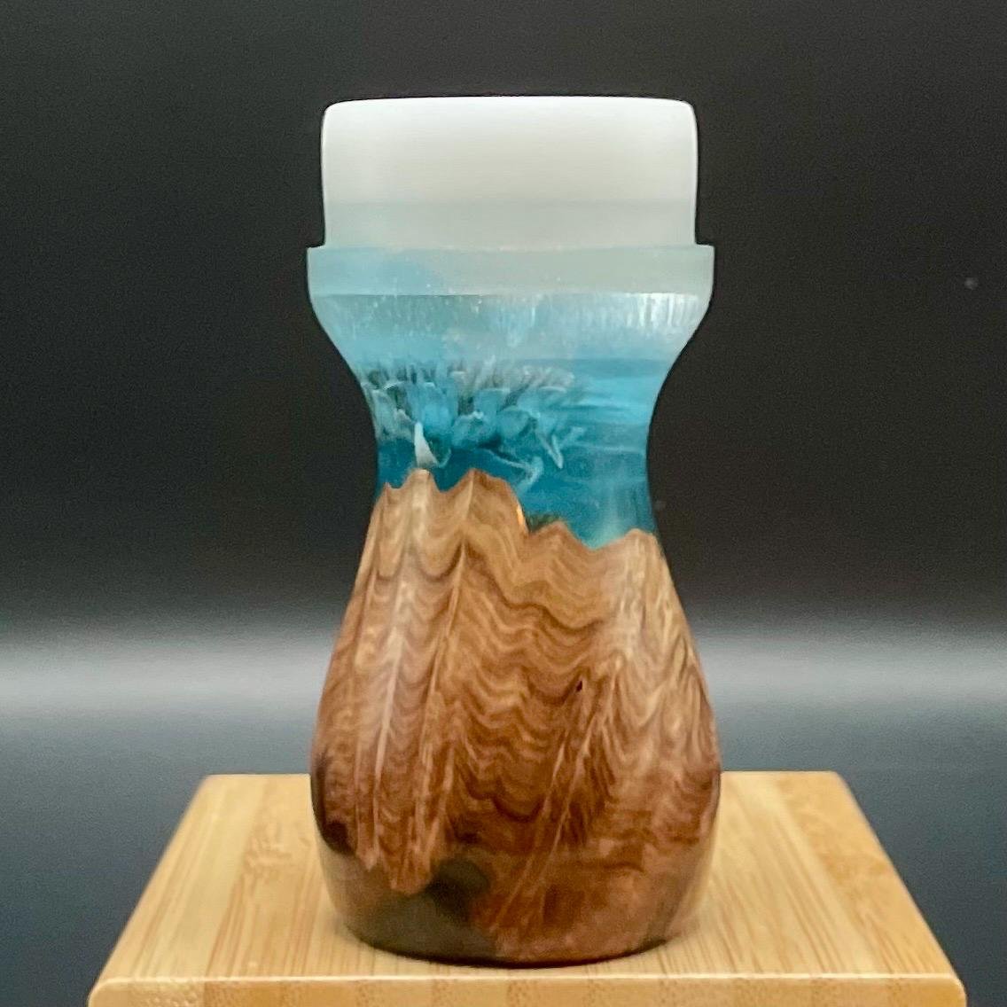 The Uiure is a tribute to the living wonder of the Great Barrier Reef—handcrafted by me in Emerald Beach, Australia. At its base is a striking piece of native brown mallee burl, its layered, swirling grain like waves upon waves of wood caught in motion. From its top rises a knobby, coral-like burl formation, encased in soft blue epoxy resin that evokes the clear shallows of the Coral Sea. A delicate white spiky flower rests within—like a lone bloom drifting across a reef bed—while the top of the handle fades to pure white where the knot meets the sky.
