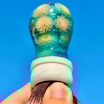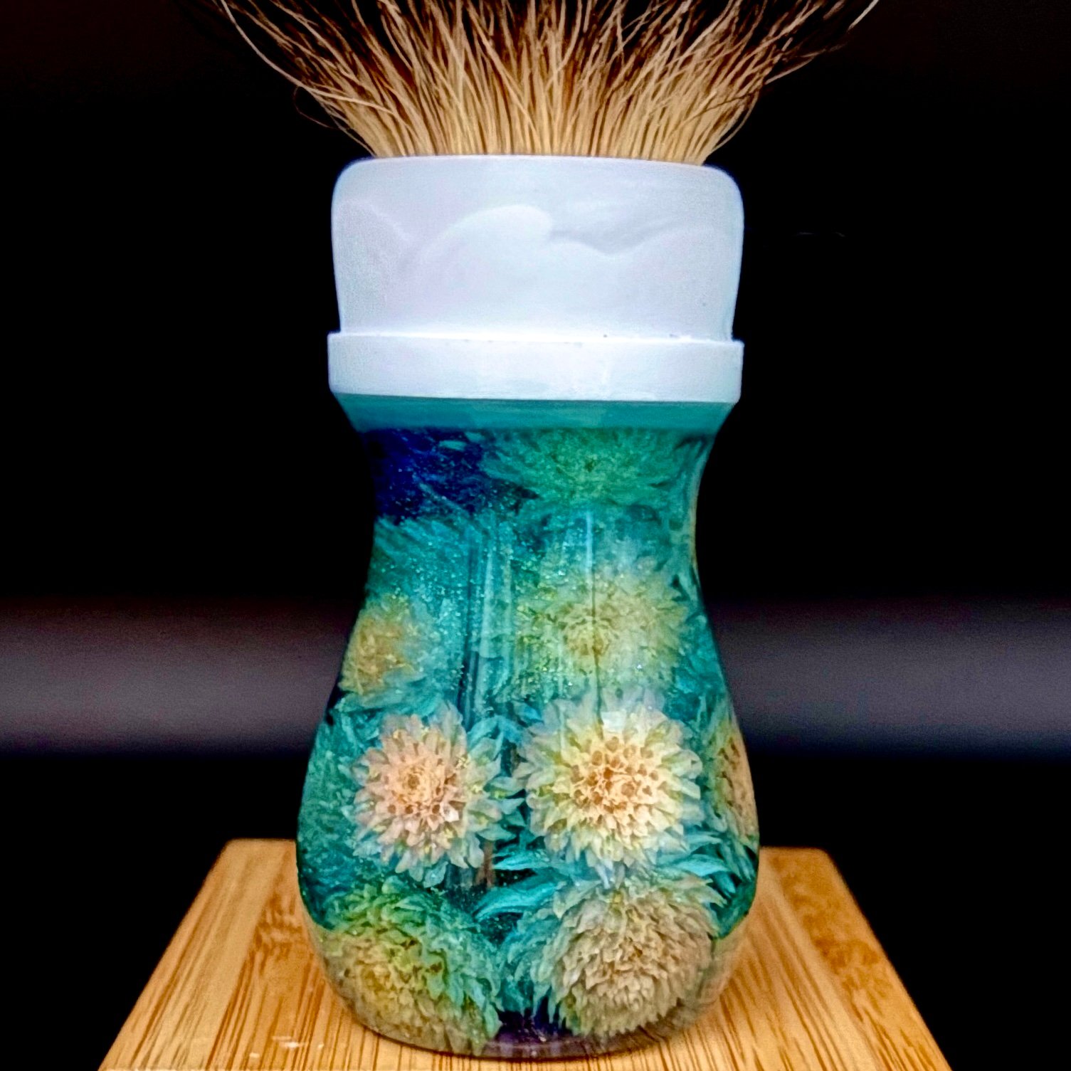 Introducing the Yallaroo series – a one-of-a-kind shaving brush, handcrafted with care and intention in Emerald Beach, NSW. This piece is born from the land, shaped by hand, and inspired by the beauty that blooms around us. The handle is cast in clear epoxy, glowing softly with specks of turquoise shimmer like morning light on ocean waves. Suspended within are white and purple Globe Amaranth flowers—edible, delicate, and full of story. I picked these flowers myself, dried them gently, and embedded them in resin before turning the handle on my lathe. Its smooth, flowing form is no accident: I believe that simple design is not only more elegant, but better in the hand. Balanced, tactile, and honest.